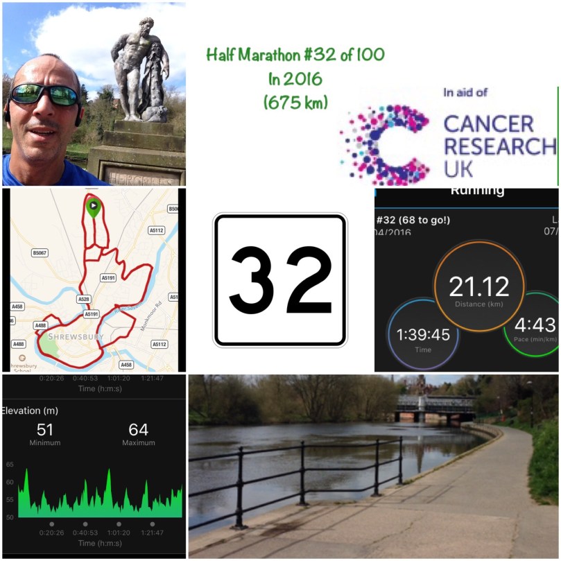 I ran from home to Ditherington, Castelfields along the River, crossed the Castlewalk Bridge to Abbey Foregate, crossed the English Bridge and went back down to the River and ran in the Quarry where I took a selfie with Hercules 🙂