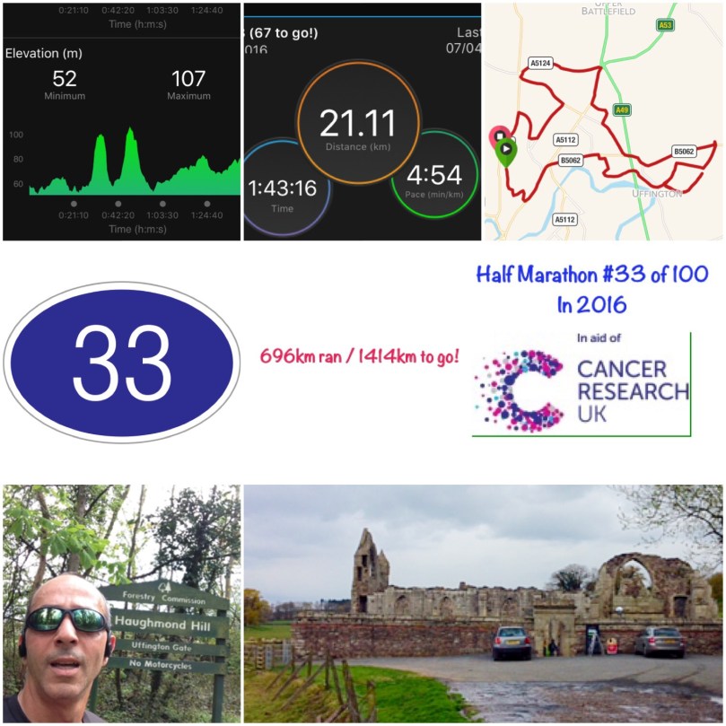 Started at home and ran to Ditherington, up Sundorne Rd and to the Sports Village, followed the path towards The old Shrewsbury Canal to Uffington and for a bit up Haughmond Hill, then back down again and crossed this big muddy field, and ended up at the Abbey ruins where I took a quick selfie, down the B5062, Featherbed Lane, Battlefield Link rd, Harlescott Lane, Lancaster Rd, up Mount Pleasant and down Ellesmere Rd for easy finish.